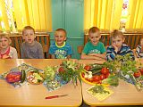 Prawidłowe żywienie ma ogromny wpływ na zdrowie i rozwój dziecka w wieku przedszkolnym, którego organizm intensywnie się rozwija. Jakość jedzenia i jego rodzaj oraz prawidłowe nawyki żywieniowe są podstawą w zapobieganiu chorobom cywilizacyjnym m.in. otyłości u dzieci. Przyzwyczajenia żywieniowe ulegają obecnie szybkim zmianom i są to, niestety zmiany w złym kierunku. Dlatego konieczne jest podejmowanie działań na rzecz korygowania przyzwyczajeń i kształtowania właściwych nawyków żywieniowych przedszkolaków. "Warsztaty kulinarne" to dla przedszkolaków zabawa i wielka przygoda, których efektem są właściwe nawyki żywieniowe. W środę 18 kwietnia "Krasnoludki" tym razem, samodzielnie przygotowywały pyszne śniadanie. Działania poprzedziła pogadanka na temat zachowania higieny , a także jedzenia zdrowych produktów. Wielką radość sprawiło dzieciom układanie na kanapkach kompozycji z przyniesionych, ulubionych nowalijek. Ostatnim etapem była degustacja kanapek. Po minach dzieci i pustych talerzykach widać było, że kanapki były wyjątkowe i do tego bardzo smaczne!
