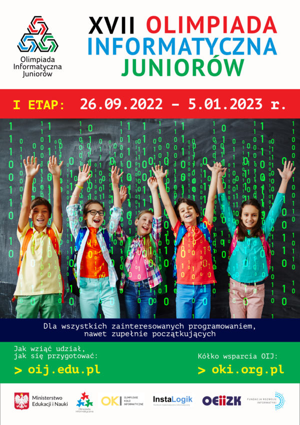 Zachęcamy do udziału w XVII Olimpiadzie Informatycznej Juniorów. Szczegóły na stronie oij.edu.pl