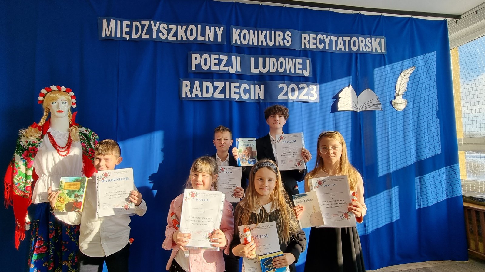 Nasi uczniowie: Oliwia Kordas, Lena Książek, Gabriela Korniak, Kacper Dudek, Michał Habza i Karol Tchórzewski wzięli 4 grudnia udział w XVIII Międzyszkolnym Konkursie Recytatorskim Poezji Ludowej w Radzięcinie. Wszyscy pięknie recytowali wiersze poetek ludowych z terenu naszej gminy, ale jury szczególnie doceniło interpretacje w wykonaniu: