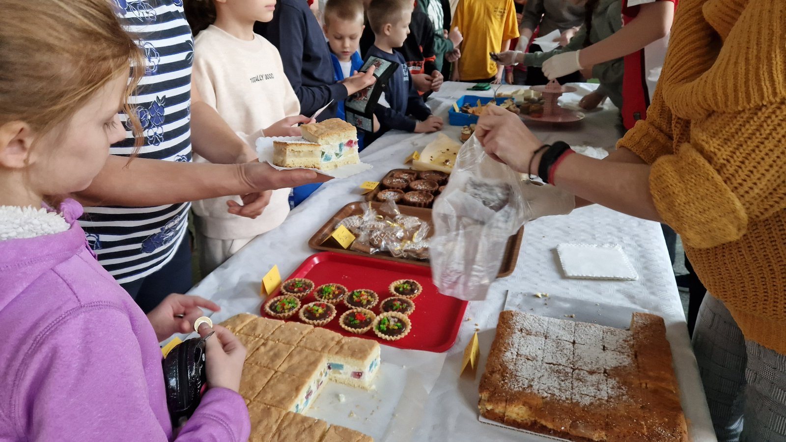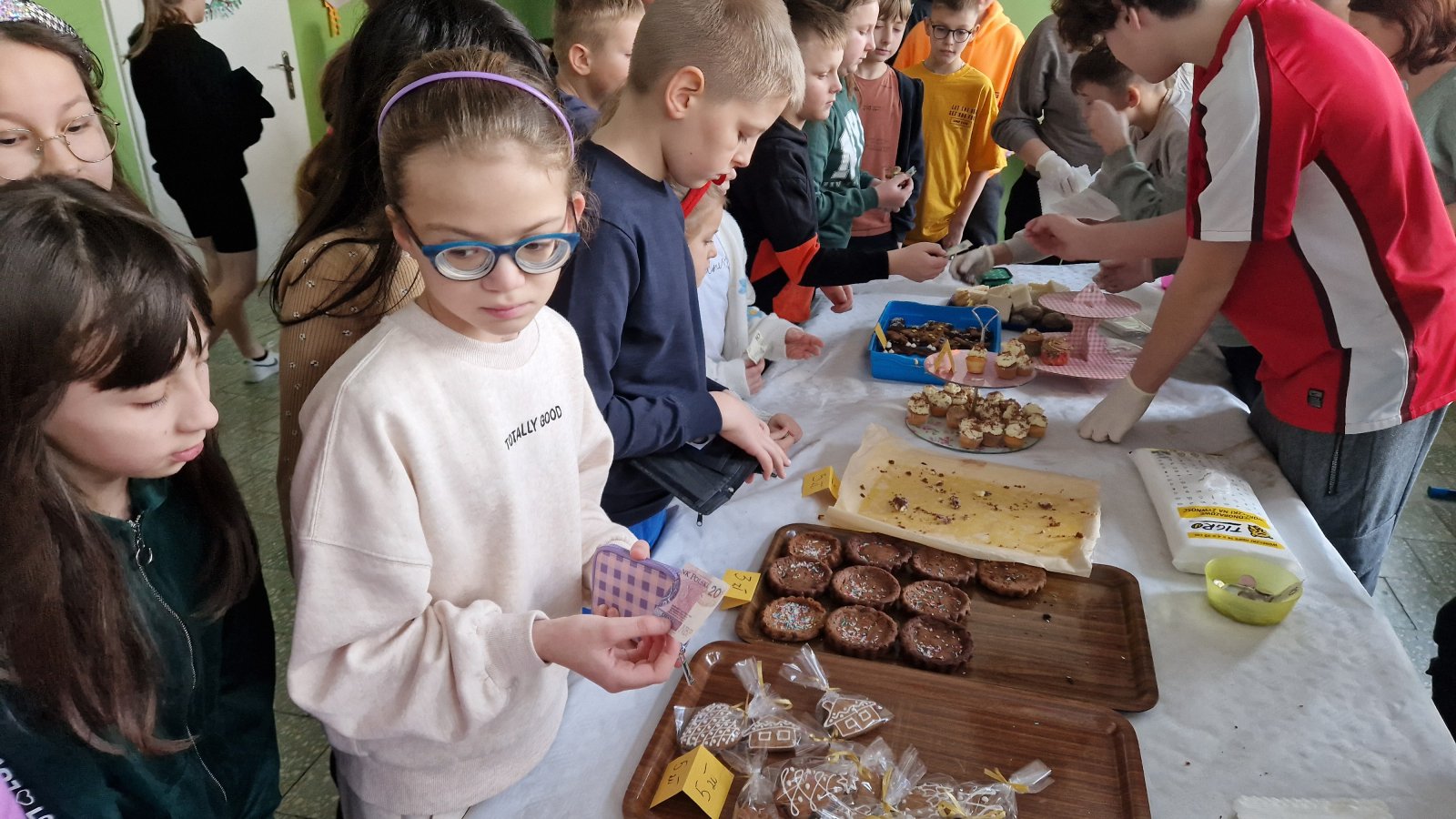 Na przerwach można było kupić przepyszne wypieki: ciasta, ciasteczka, babeczki, pierniczki, rurki, mini deserki… Każdy mógł znaleźć dla siebie coś pysznego. Niskie ceny i wyjątkowa różnorodność słodkiego asortymentu sprawiły, że kupujących nie brakowało. Pieniądze zebrane dzięki kiermaszowi zostaną przeznaczone na organizacje balu ósmoklasisty.