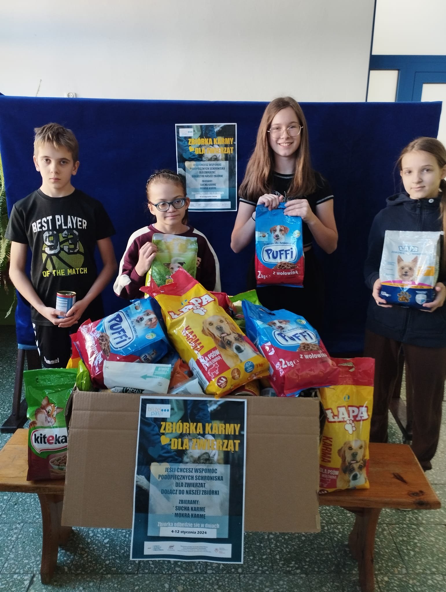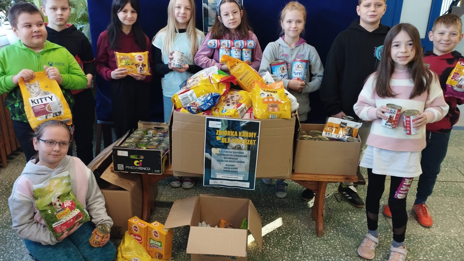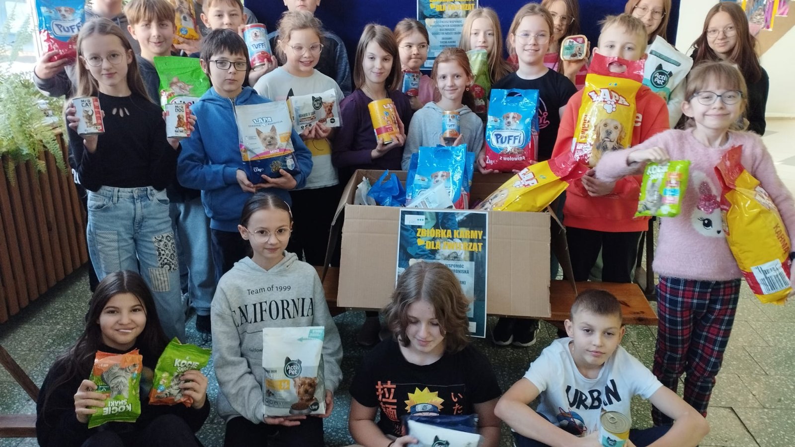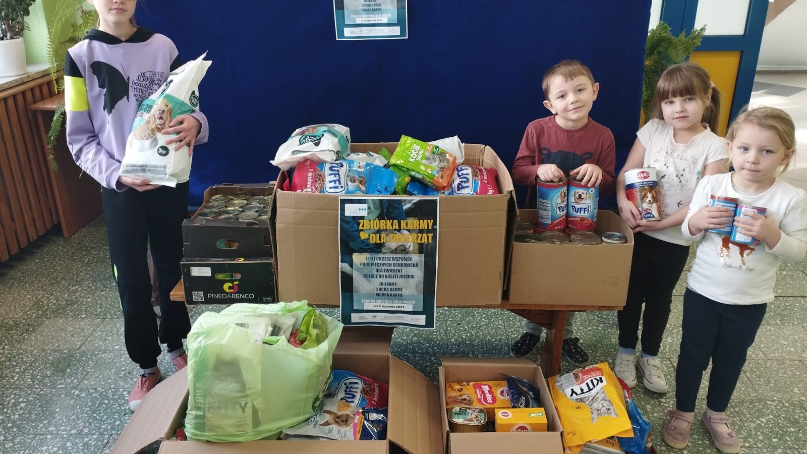 Akcja przeprowadzona w dniach 4-12 stycznia 2024 r. przez Szkolne Koło Wolontariatu spotkała się z dużym odzewem wśród uczniów i przedszkolaków. Dzięki temu udało się nam zgromadzić pokaźną ilość karmy suchej i mokrej, która już trafiła do schroniska. Dziękujemy za otwarte serca i chęć pomocy bezdomnym zwierzętom.